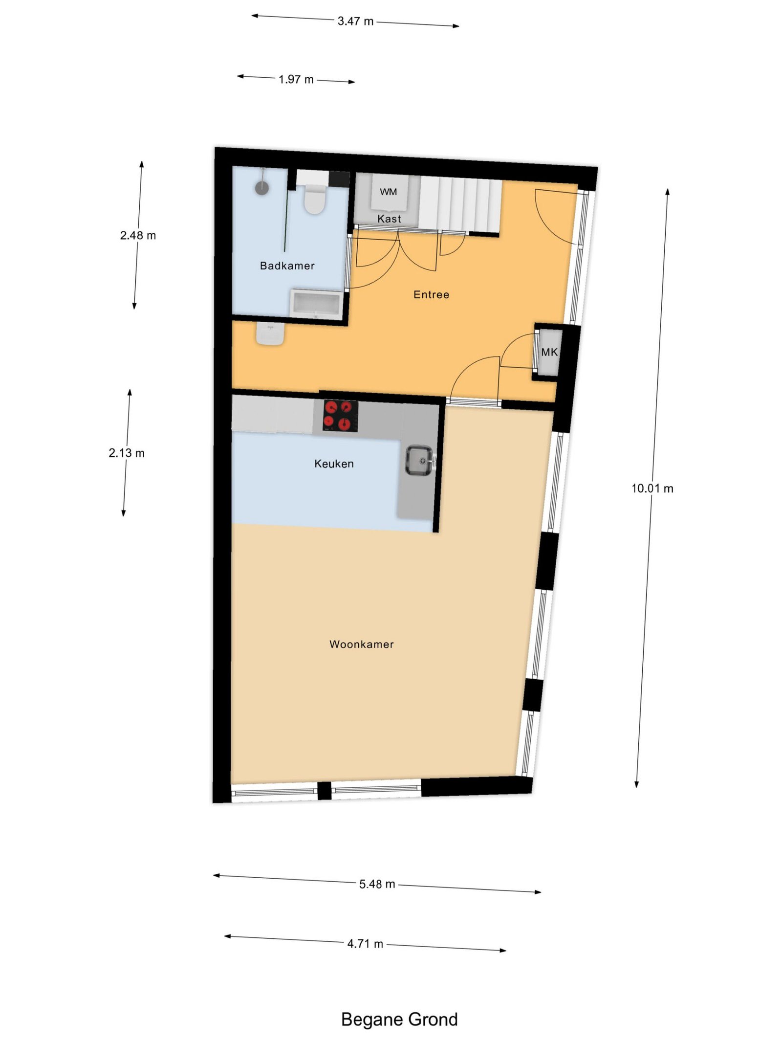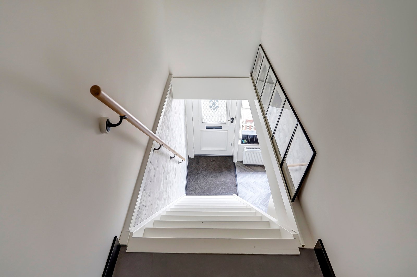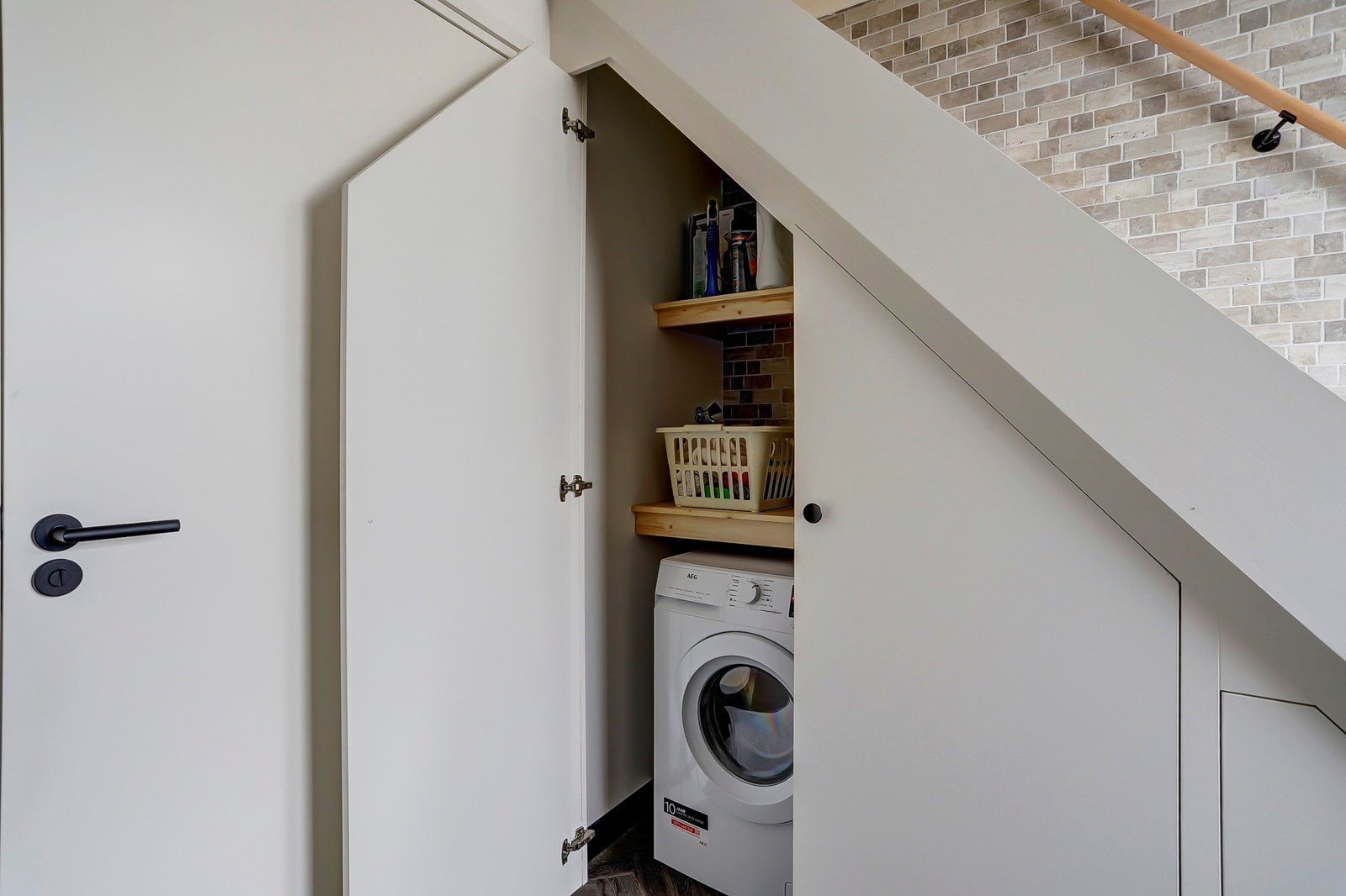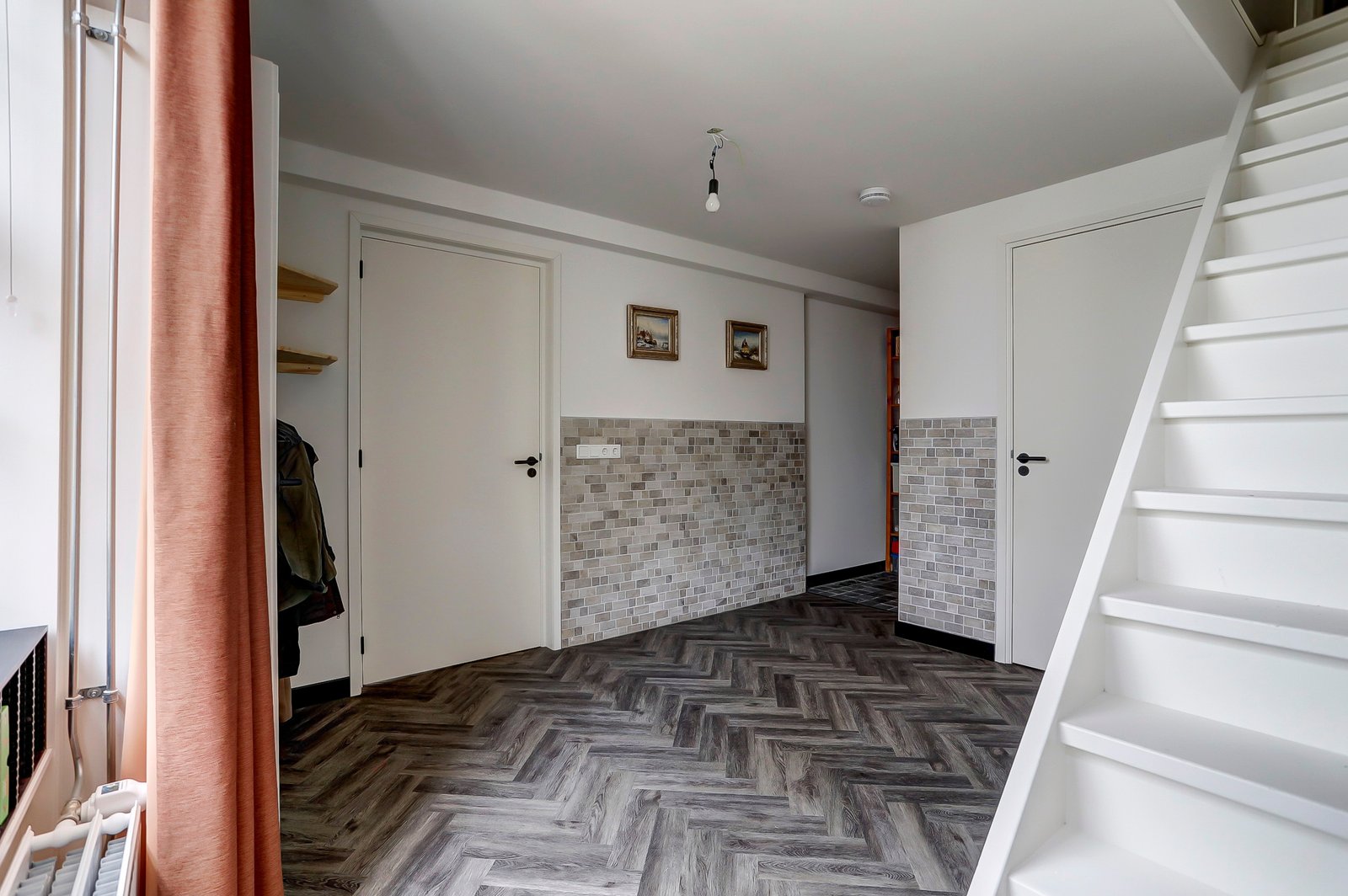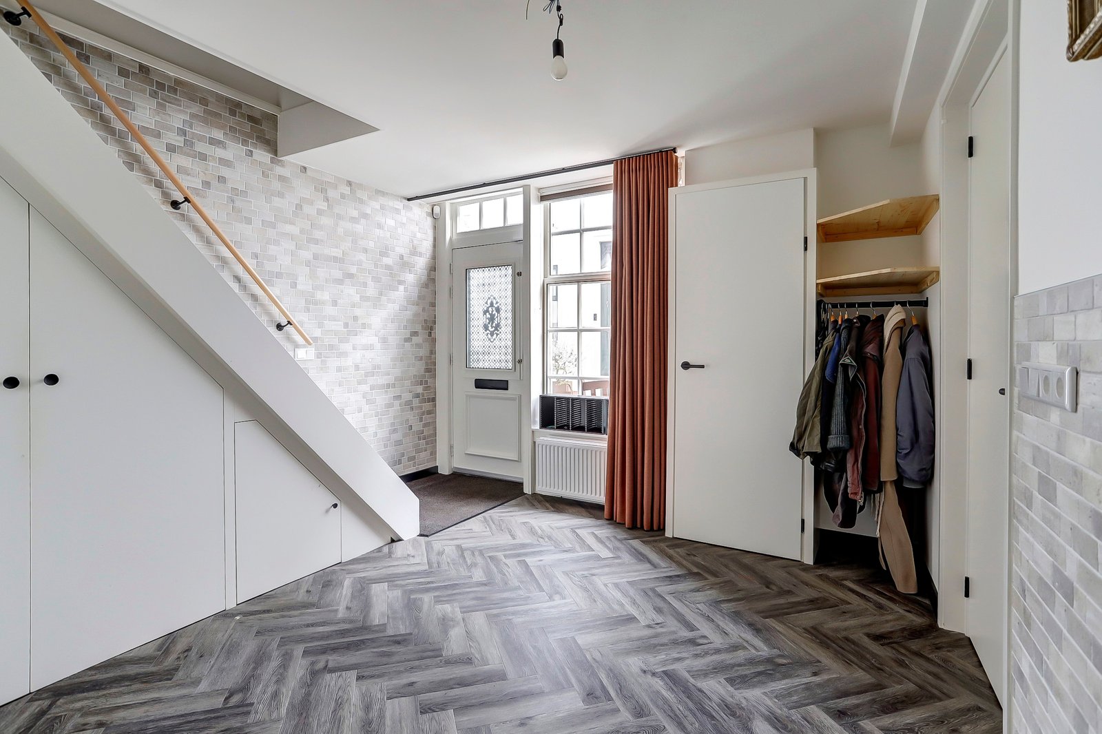Zij-entree, ruime hal met volledig vernieuwde meterkast en garderoberuimte, trapkast met de wasmachine aansluiting, moderne badkamer op de begane grond met zwevend toilet, inloopdouche, wastafelmeubel met lades en een handdoekradiator. In de hal nog een hele ruime berghoek voor opslag of plaatsen van fietsen (deze ruimte is eventueel ook dicht te maken)