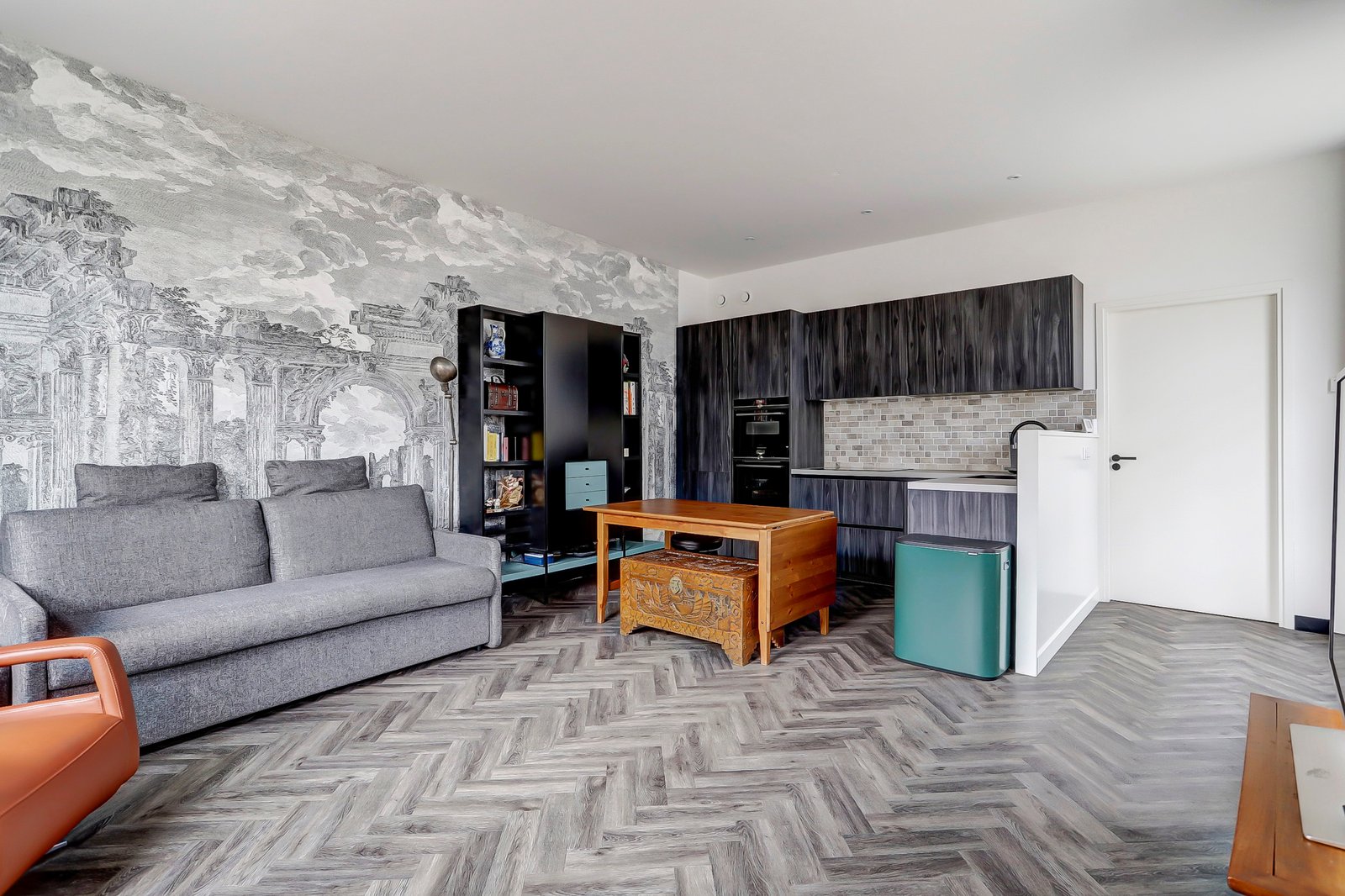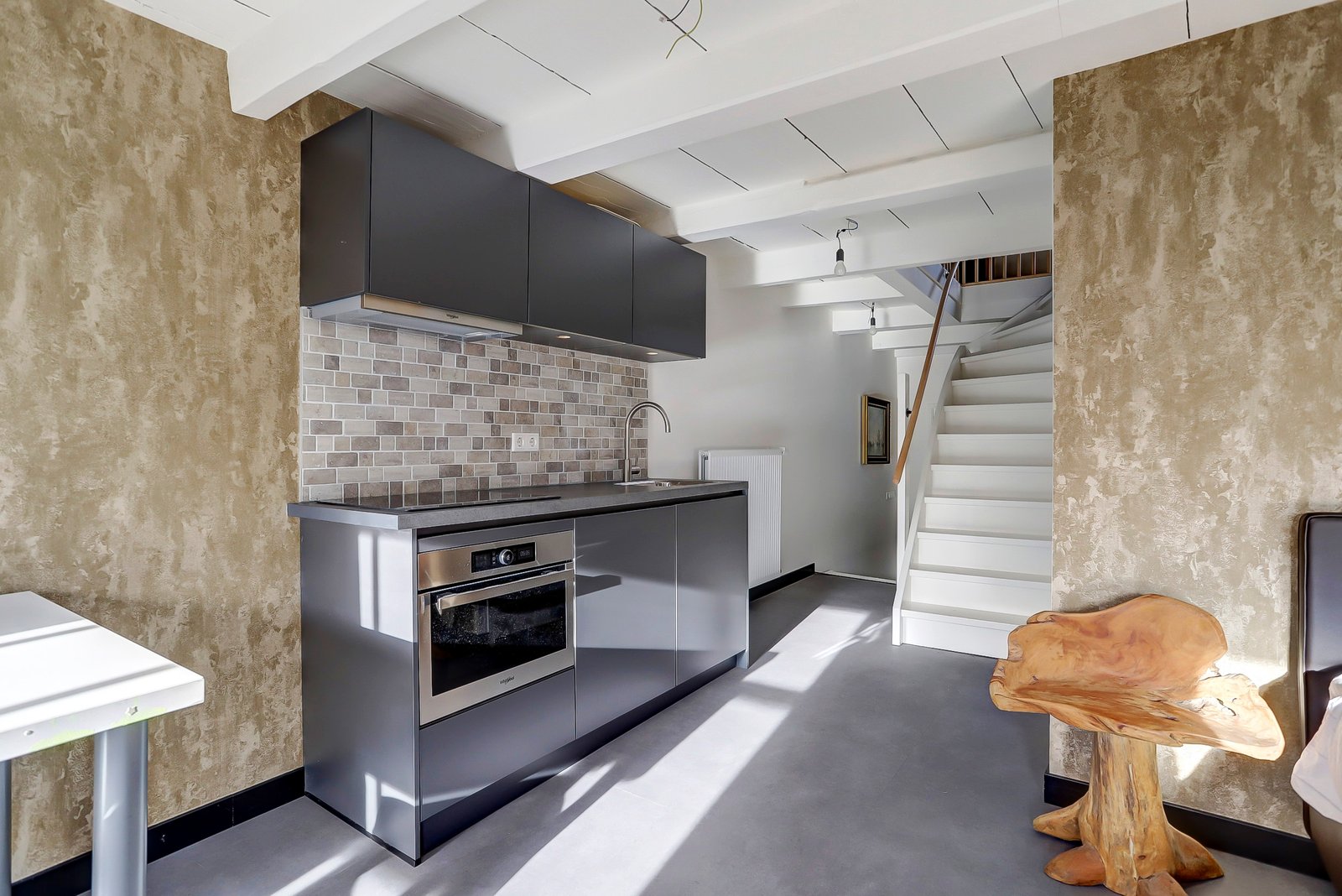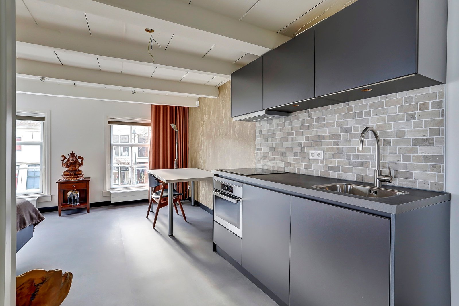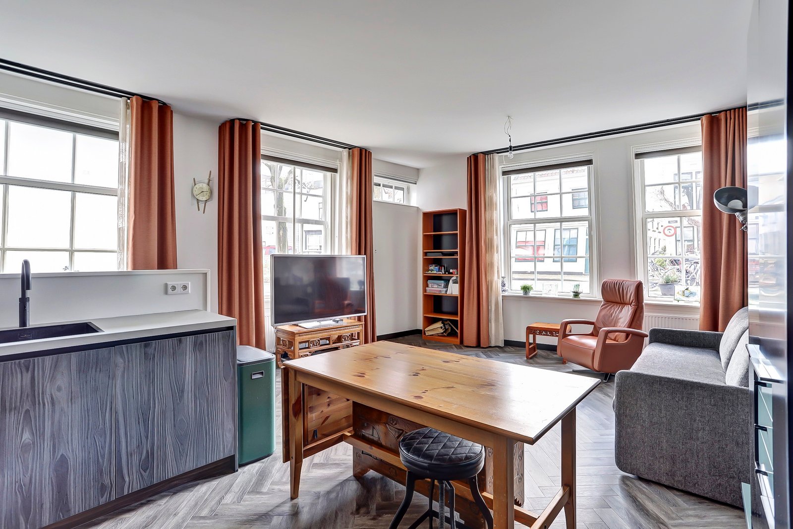Ruime en vanwege de hoekligging ook lichte woon-eetkamer van ca. 10.00 x 5.48 (incl de ruimte van de open keuken). De keuken is modern uitgevoerd en voorzien van diverse inbouw apparatuur zoals een inductie kookplaat, een Quooker, 2x een oven/magnetron en een koel-vrieskast.