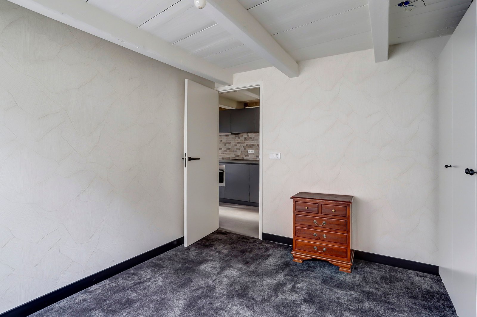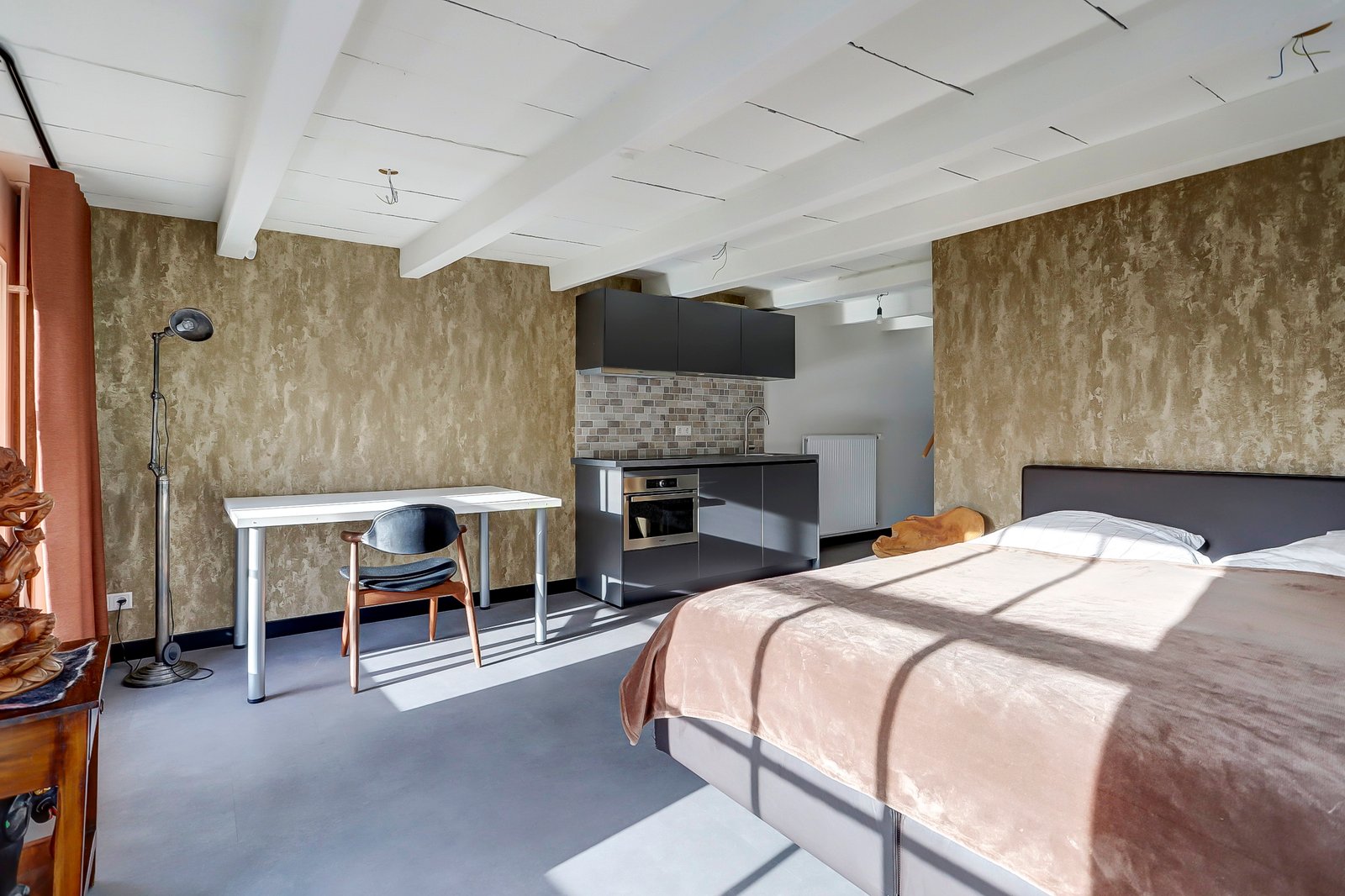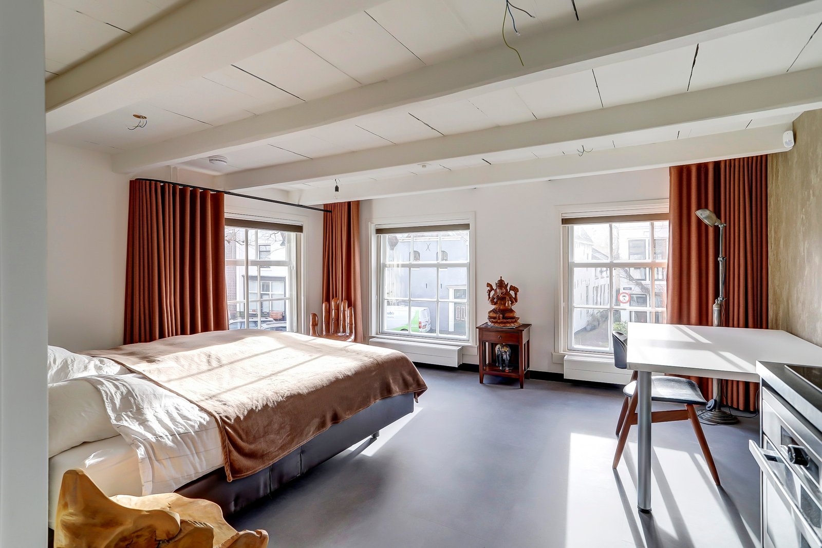 Op deze etage bevind zich in feit een mini appartement, allereerst een overloop met vaste kast, een moderne badkamer met zwevend toilet, ruime inloopdouche en een wastafelmeubel met lades. Een aparte slaapkamer van ca. 3.52 x 2.35. Aan de voorzijde een open ruimte van ca. 4.59 x 3.91 met een keukenblok met tevens en inductie kookplaat, combi oven/magnetron en een koelkast. Deze etage is zeer sfeervol vanwege het mooie balken plafond.
