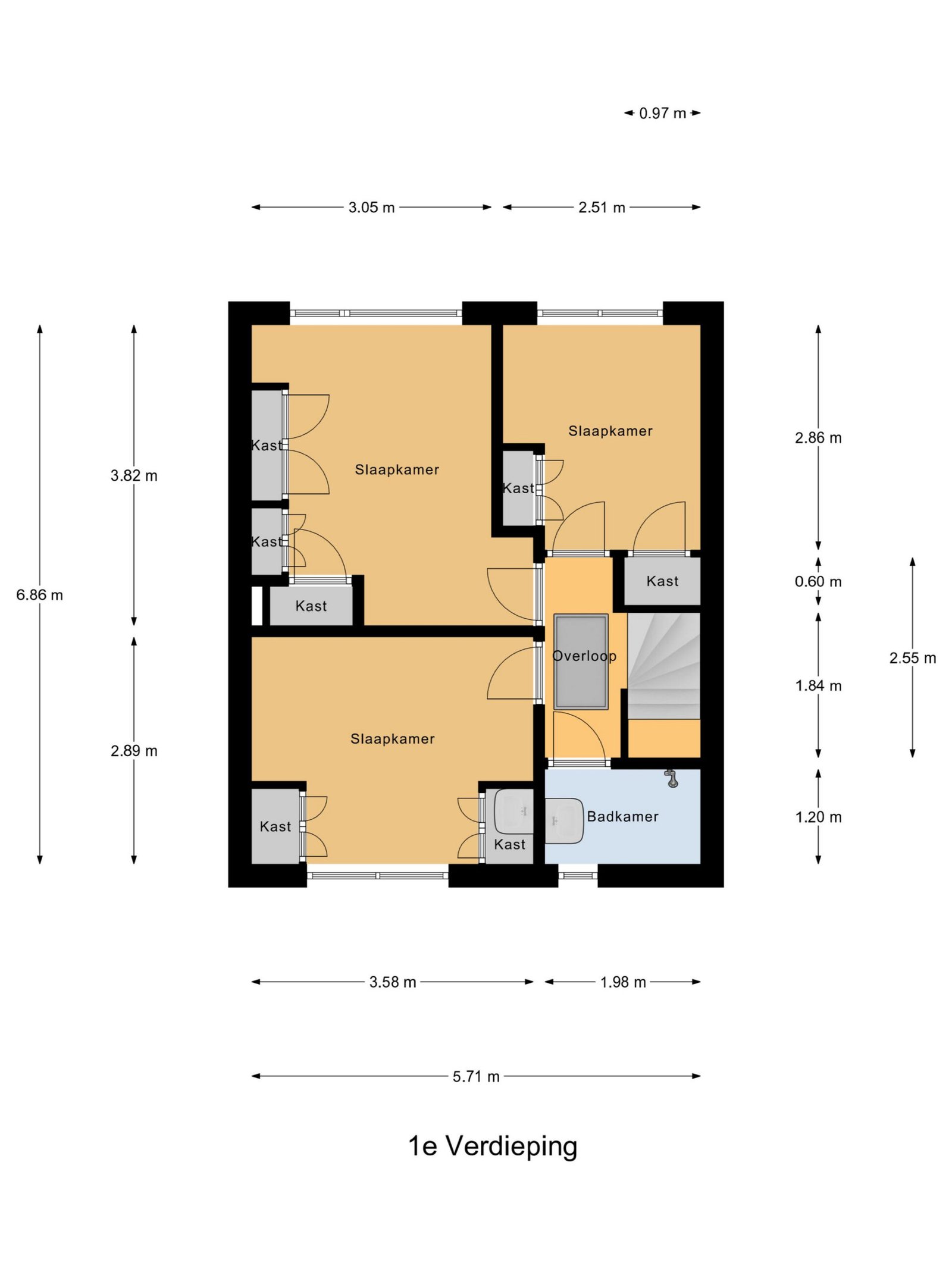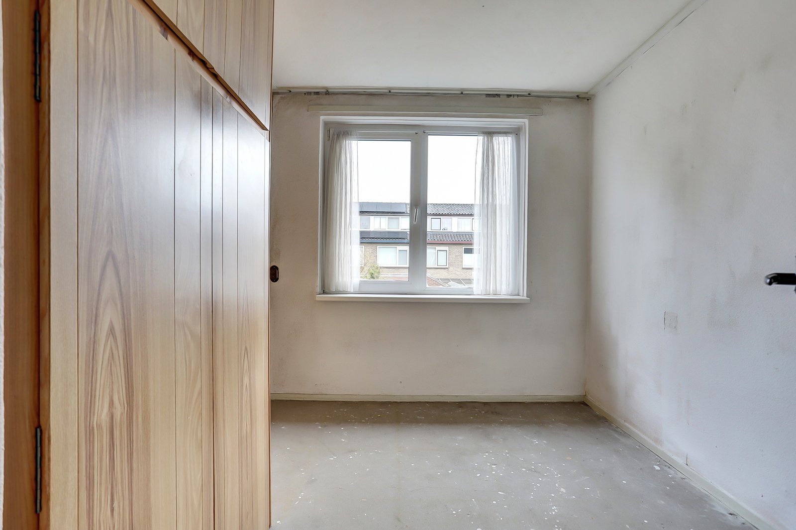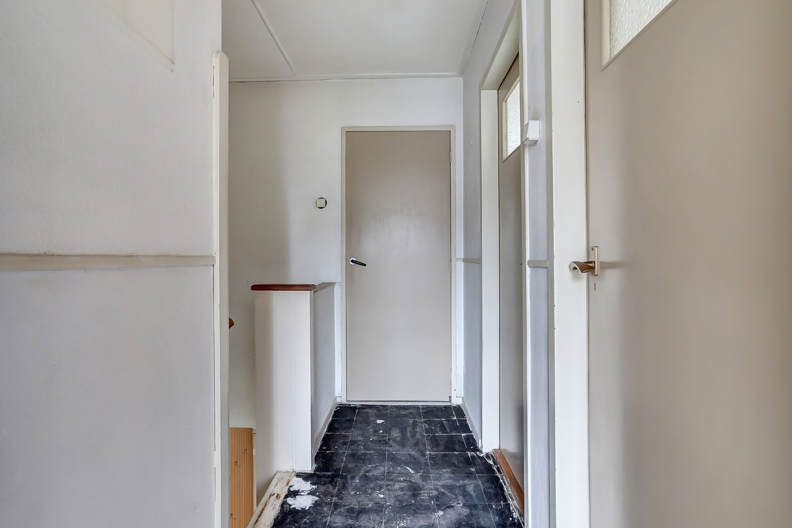 De trap brengt u naar de overloop met toegang tot drie slaapkamers en de badkamer. Aan de achterzijde liggen twee slaapkamers: de eerste (ca. 2,7 m x 2,5 m) met twee inbouwkasten, en de tweede (ca. 3,8 m x 3,5 m) met drie inbouwkasten. De slaapkamer aan de voorzijde (ca. 2,9 m x 3,6 m) beschikt over twee inbouwkasten en vernieuwde kozijnen. De eenvoudige badkamer is voorzien van een enkele wastafel en een douche; ook hier zijn de kozijnen vernieuwd.