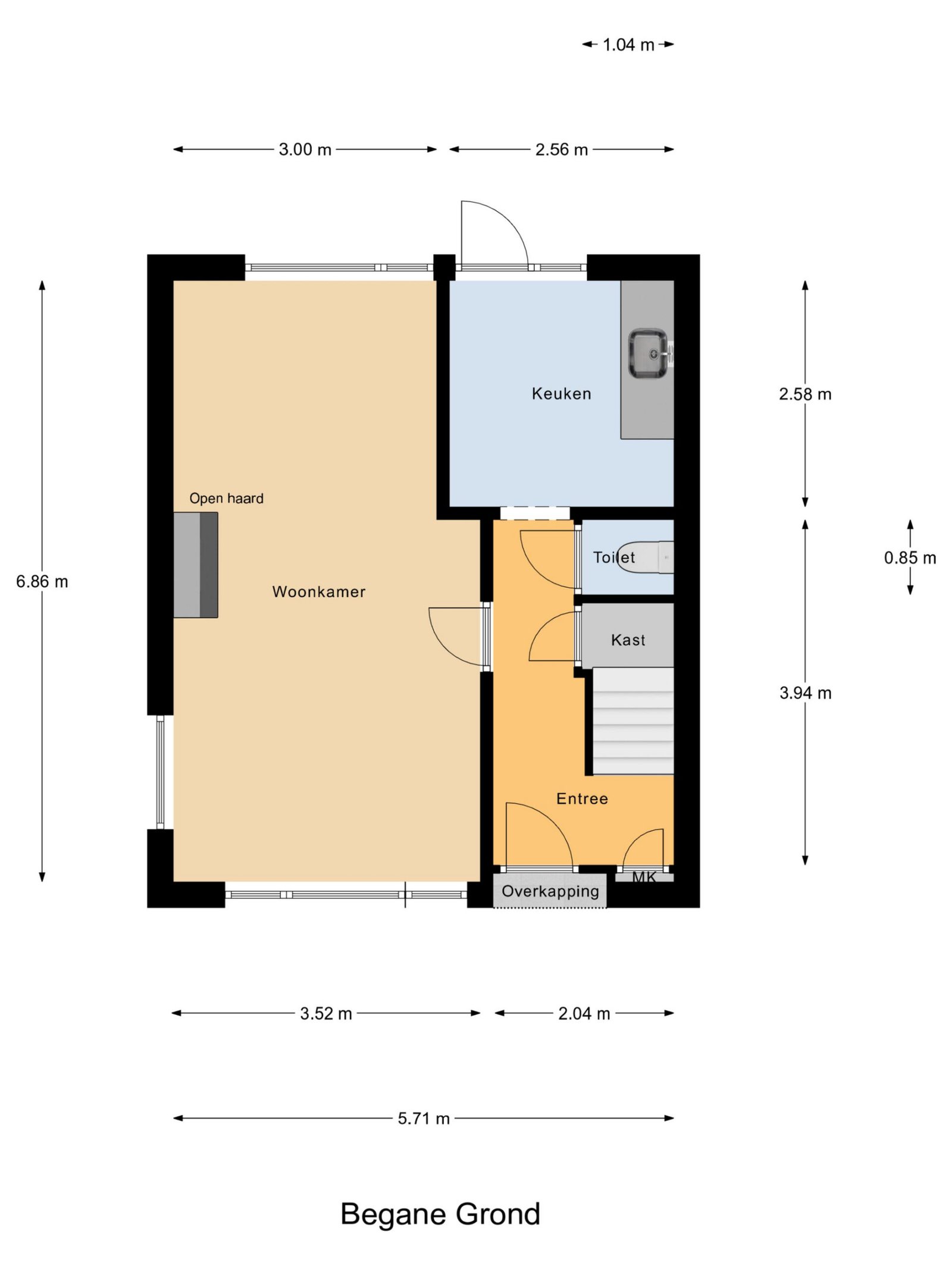 Voortuin met toegang tot de woning. Via de entree komt u in de hal, waar aan de rechterzijde direct de trap naar de eerste etage en de meterkast zijn gesitueerd. Verderop in de hal vindt u rechts de opbergkast en het toilet. Links loopt u door naar de woonkamer met moederhaard; aan de voor- en zijkant zijn in 2025 de kozijnen volledig vernieuwd. Aan het einde van de hal bevindt zich de keuken met een eenvoudig keukenblok en toegang tot de achtertuin.